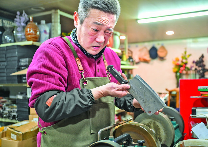 ▲12月9日,商户在查看打磨的菜刀。 初冬的上午,天津的“修补巷”很是热闹,磨菜刀、修自行车……几十家开在巷子里的“修补小店”不断迎来顾客。“修补巷”位于王串场街道幸福道商业街内。周边的社区居民对“小修小补”的需求强烈,却苦于“修的地方”越来越少。于是,王串场街道在商业街内闲置铺面内集中引入了磨刀、织补、配钥匙、修表等便民业态。2024年6月,“修补巷”正式开街,如今已成功吸引约30家“小修小补”店铺入驻,让居民看得见、找得着,满足群众便利生活的需要。