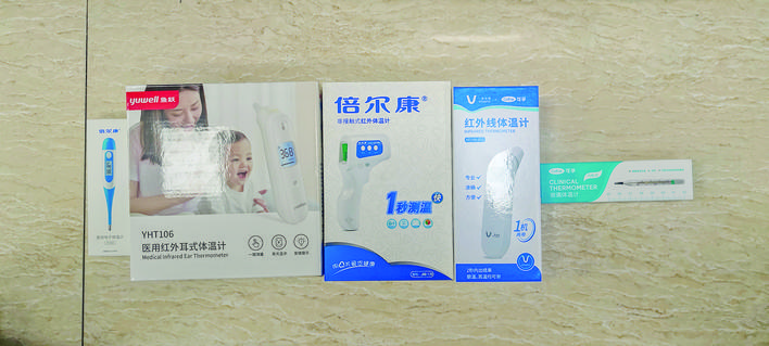 ▲运城市盐湖区一家药店中各式各样的体温计记者 刘亚 摄