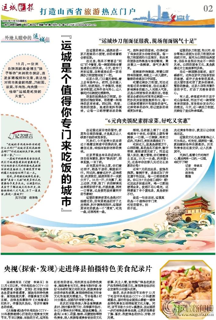 运城晚报讯(记者 李婉玉)自11月4日以来,中央电视台CCTV-10科教频道《探索·发现》栏目组受绛县县委宣传部邀请,围绕寻找特色美食、展现地域风情、传播美食文化等主题,在绛县拍摄制作《大地餐桌》纪录片,传播民风民俗,寻访