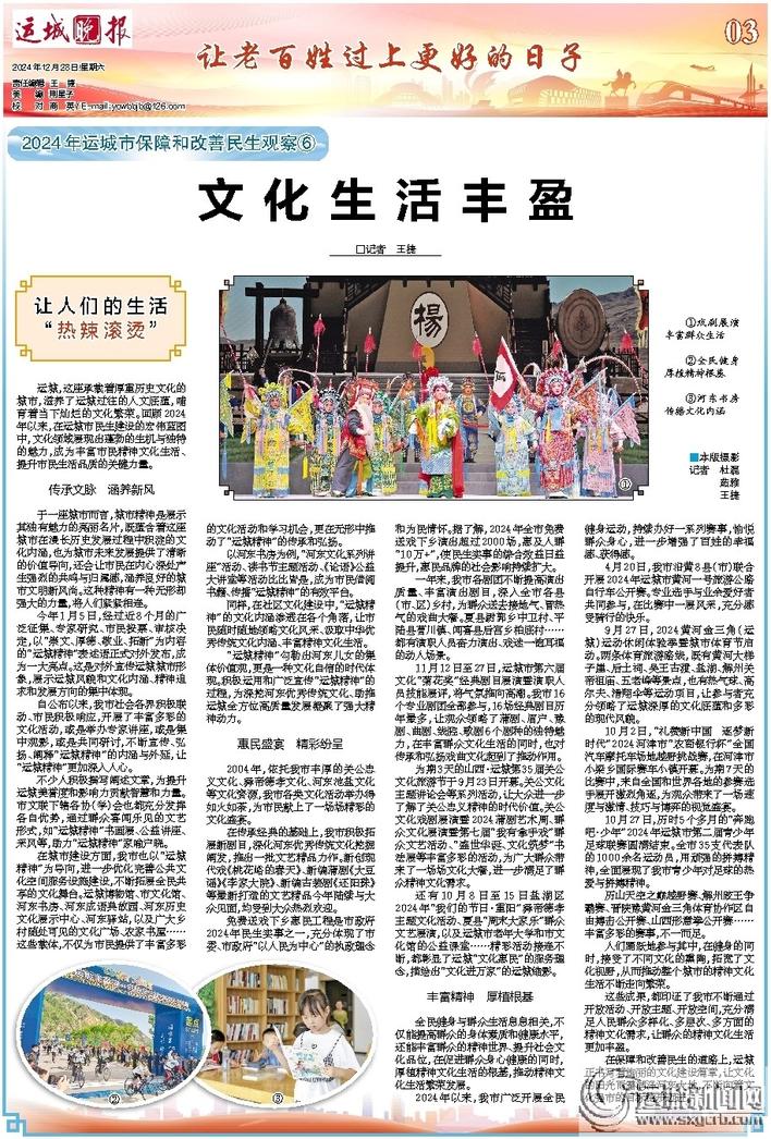 运城,这座承载着厚重历史文化的城市,滋养了运城过往的人文底蕴,哺育着当下灿烂的文化繁荣。回顾2024年以来,在运城市民生建设的宏伟蓝图中,文化领域展现出蓬勃的生机与独特的魅力,成为丰富市民精神文化生活、提升市民生活品质的关