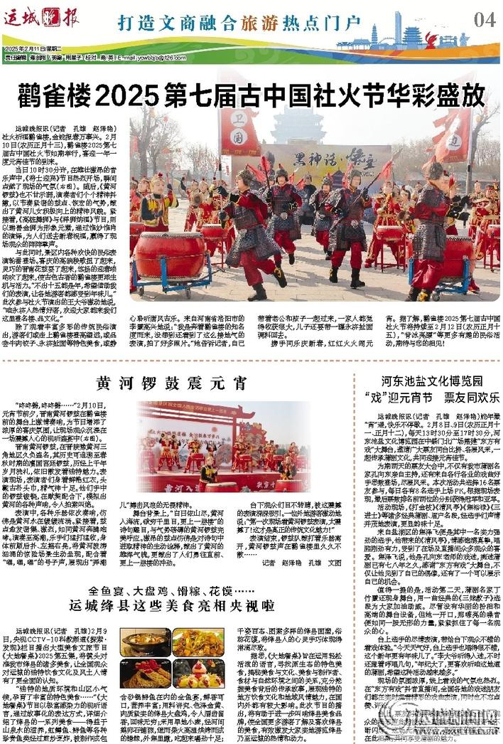 运城晚报讯(记者 孔雄 赵泽艳)社火祈福鹳雀楼,金蛇报春万事兴。2月10日(农历正月十三),鹳雀楼2025第七届古中国社火节如期举行,喜迎一年一度元宵佳节的到来。