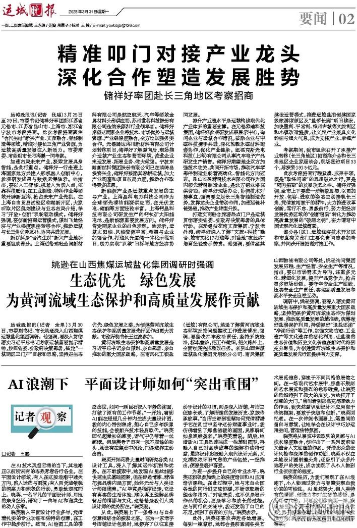 运城晚报讯(记者 余果)3月30日,市委副书记、市长姚逊深入山西焦煤运城盐化集团调研。他强调,要深入贯彻落实习近平总书记考察运城重要指示精神,按照省委、省政府决策部署,锚定“一城两区三门户”目标和思路,坚持走生态优先、绿色