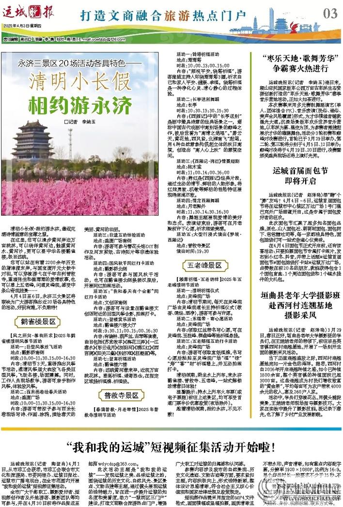 运城晚报讯 4月2日,市气象局发布清明节期间天气预报。预计清明节期间,我市以多云到晴天气为主,气温总体呈回升趋势,最高气温将升至22℃~25℃。