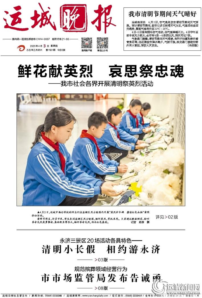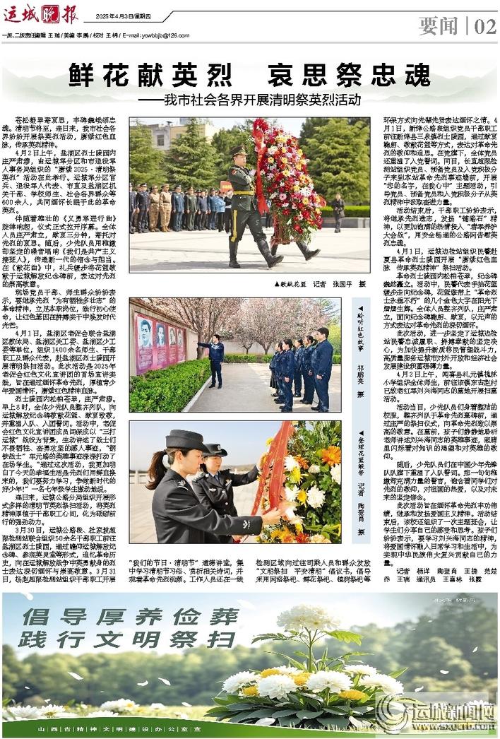 ▲4月2日,运城市海仓学校的师生们在盐湖区烈士陵园内开展“英烈护丰碑 赓续红色血脉”清明祭扫活动。 清明节将至,许多市民、学生来到盐湖区烈士陵园,缅怀英烈,寄托哀思。大家通过敬献鲜花、聆听革命先烈英勇事迹、集体默哀等形式