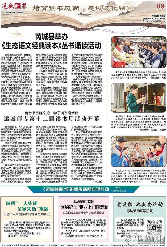 运城晚报讯(记者 杜磊)4月21日,在第30个世界读书日来临之际,运城市关心下一代工作委员会联合同芯(广州)生物科技公司走进薛辽中学,开展“读好书·护好眼”活动(右图)。