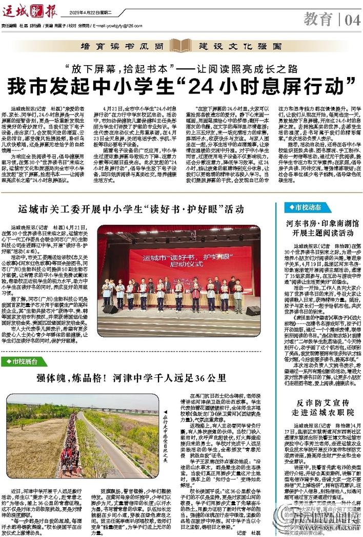 运城晚报讯(记者 杜磊)“亲爱的老师、家长、同学们,24小时息屏是一次与屏幕的短暂告别,更是一场重新发现生活美好的奇妙旅行。当我们放下电子设备,走出家门,会发现天空的湛蓝、云朵的洁白,感受微风轻拂脸颊,聆听鸟儿欢快歌唱,这