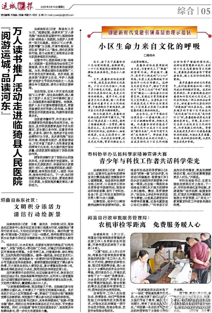 运城晚报讯(记者 陶登肖)5月14日,“阅游运城,品读河东”万人读书推广活动走进运城市中心医院临猗分院·临猗县人民医院,为医护人员带来一场文化盛宴。活动以“仁心护患、家教传馨”为主题,开展专题讲座,旨在弘扬“医者仁心”理念