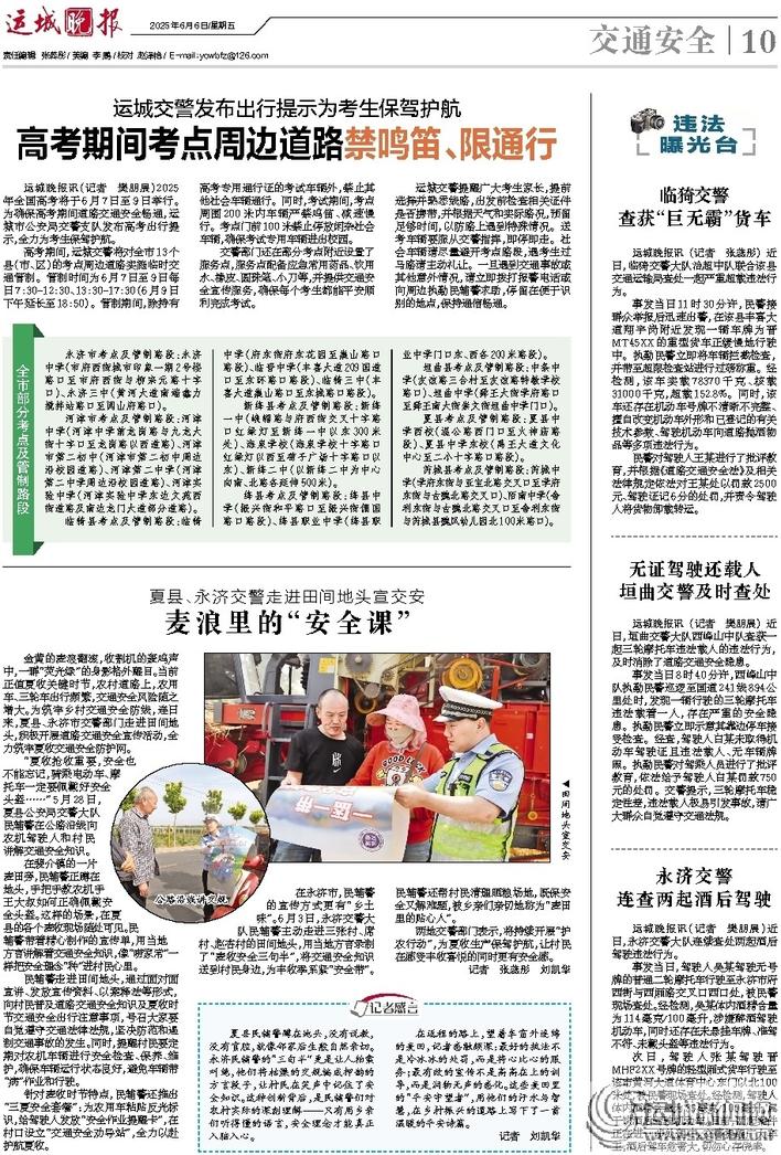 金黄的麦浪翻滚,收割机的轰鸣声中,一群“荧光绿”的身影格外醒目。当前正值夏收关键时节,农村道路上,农用车、三轮车出行频繁,交通安全风险随之增大。为筑牢乡村交通安全防线,连日来,夏县、永济市交警部门走进田间地头,积极开展道路
